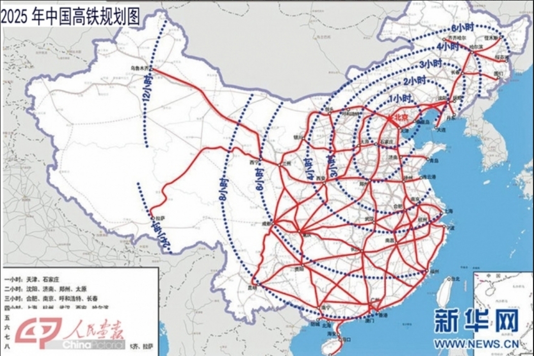 3、大规模建设阶段(2008~2017 年):2008年8月1日,中国第一条高速铁路 —— 京津城际高速铁路开通运营,这也是世界第一条运营时速 350km 的高铁。秦沈客运专线和京津城际高速铁路的工程实践,分别验证了中国设计速度 250km/h 和 350km/h 的高速铁路技术标准,为中国高速铁路大规模建设提供了支撑,一大批标志性高速铁路建成。2016 年7月13日,新修编的《中长期铁路网规划(2016)》正式印发,形成以 “八纵八横” 主通道为骨架、区域连接线衔接、城际铁路补充的高速铁路网。